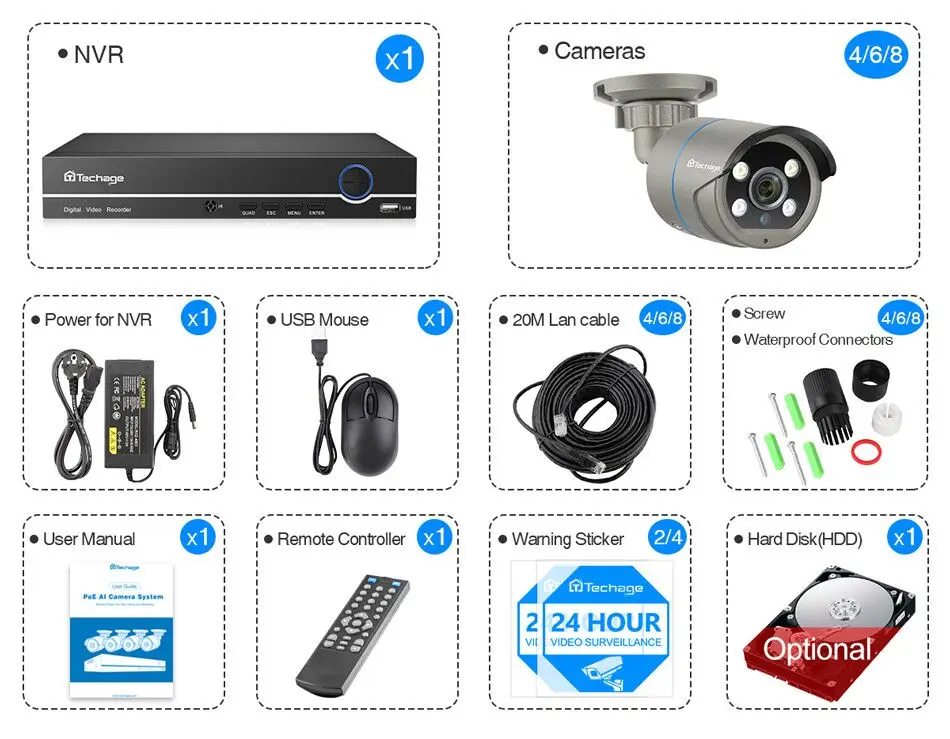 8CH POE NVR + 8 카메라/8CH POE NVR + 6 카메라/8CH POE NVR + 4 카메라/8CH POE NVR + 2 카메라 (옵션).