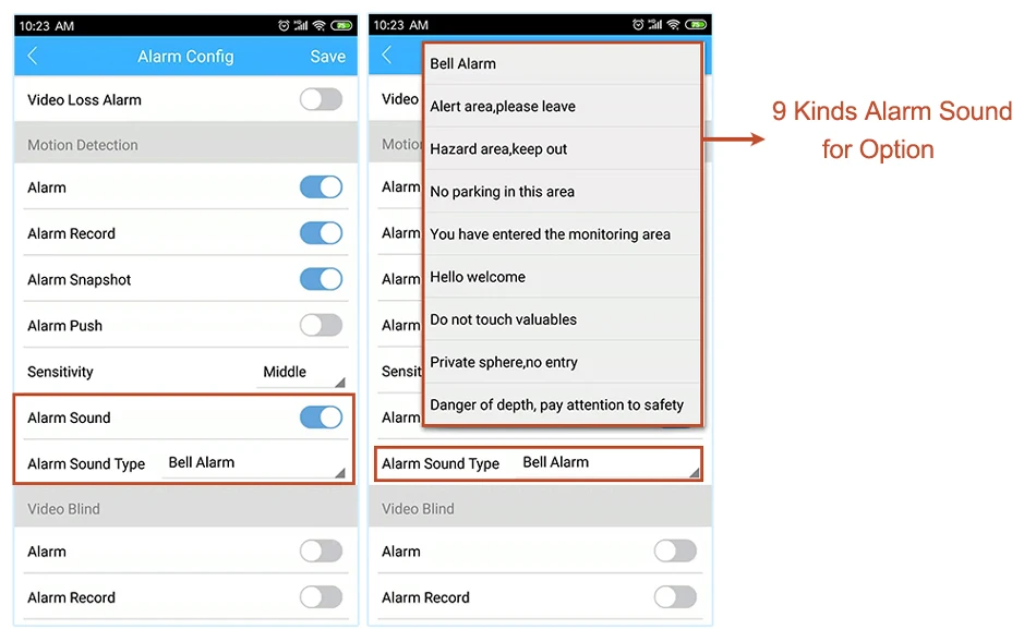 옵션을위한 9 가지 알람 소리 (영어 사운드 만 지원)