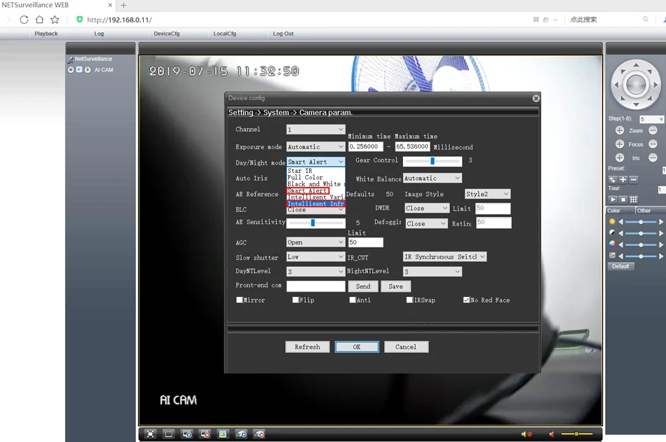 흰색 LED 표시등이 켜지면, 카메라는 야간에 다채로운 시야를 보여줄 것입니다. 선택할 수있는 세 가지 모드가 있습니다 (풀 컬러 야간 투시경, 적외선 야간 투시경 및 주간 투시경).
