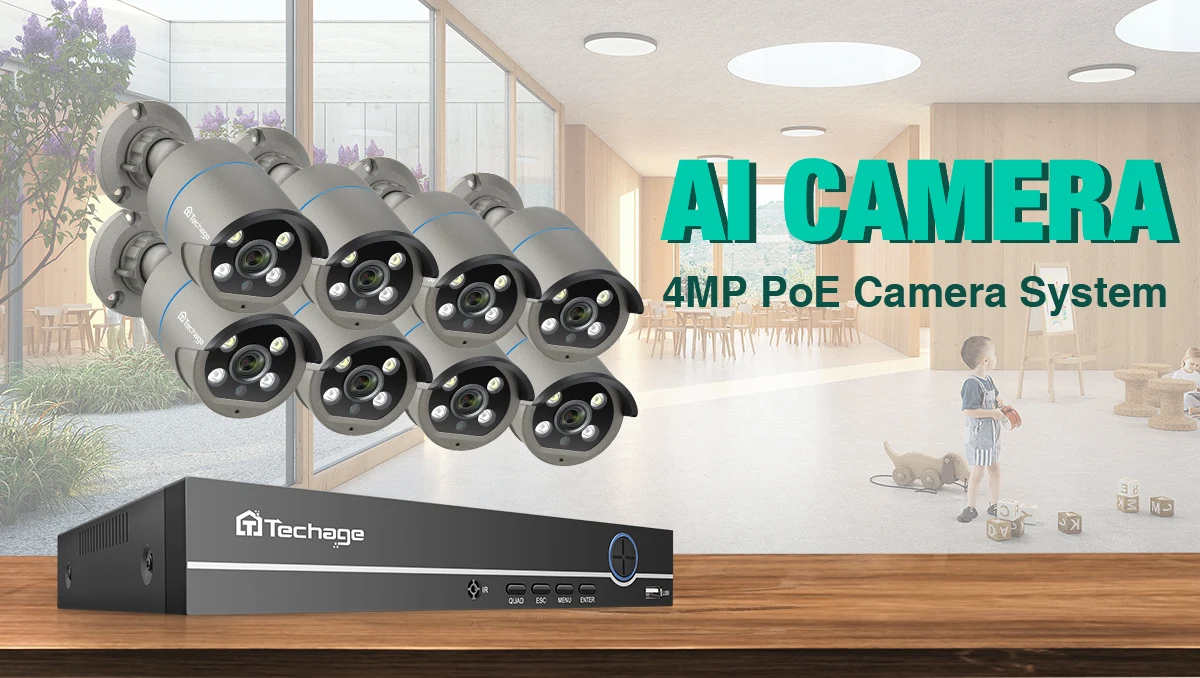 Techage-8CH 4MP POE 보안 감시 카메라 시스템 키트 AI 얼굴 감지 오디오 기록 IP 카메라, H.265 CCTV 비디오 NVR 세트