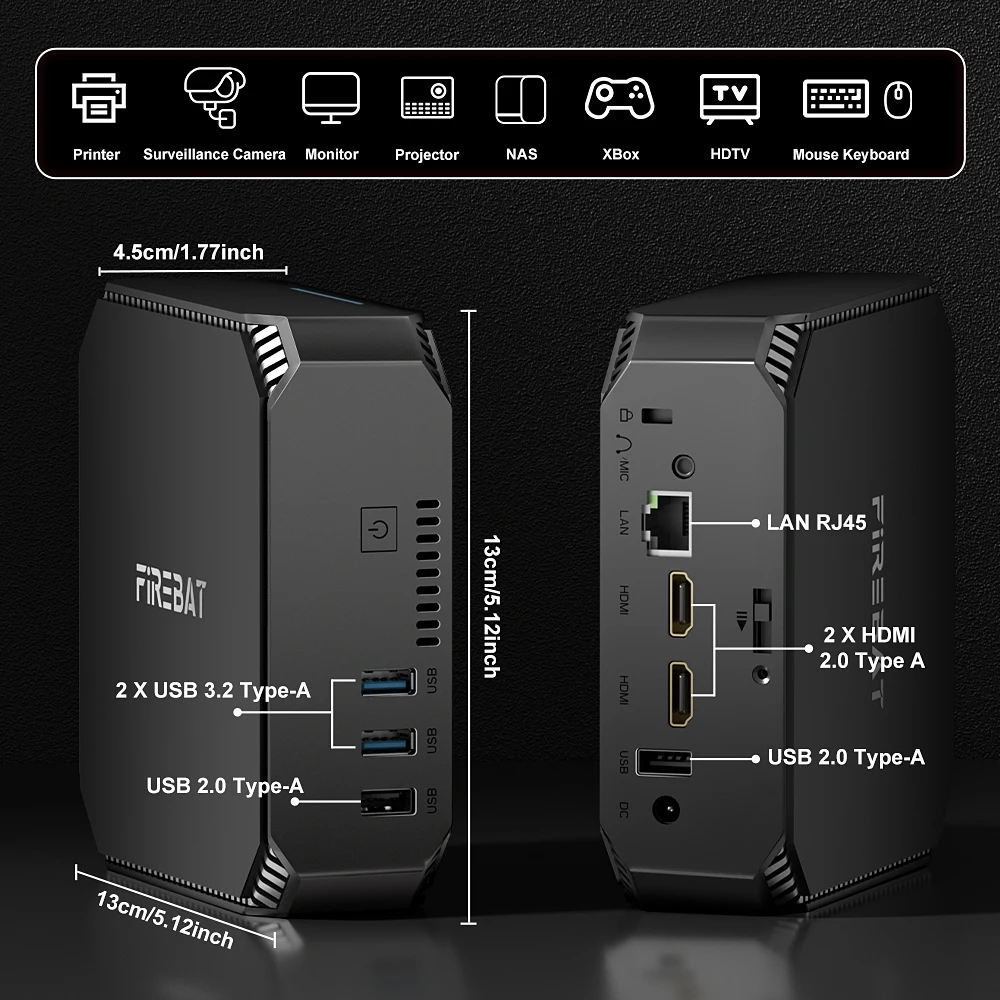 • 작고 조용한:컴팩트 한 크기와 조용한 작동으로 Firebat AK2 plus minipc는 로우 프로파일 게임 솔루션을 찾는 사람들에게 이상적인 선택입니다. 그것은 성능에 타협하지 않으나, 당신의 공간을 혼란없이 유지한다