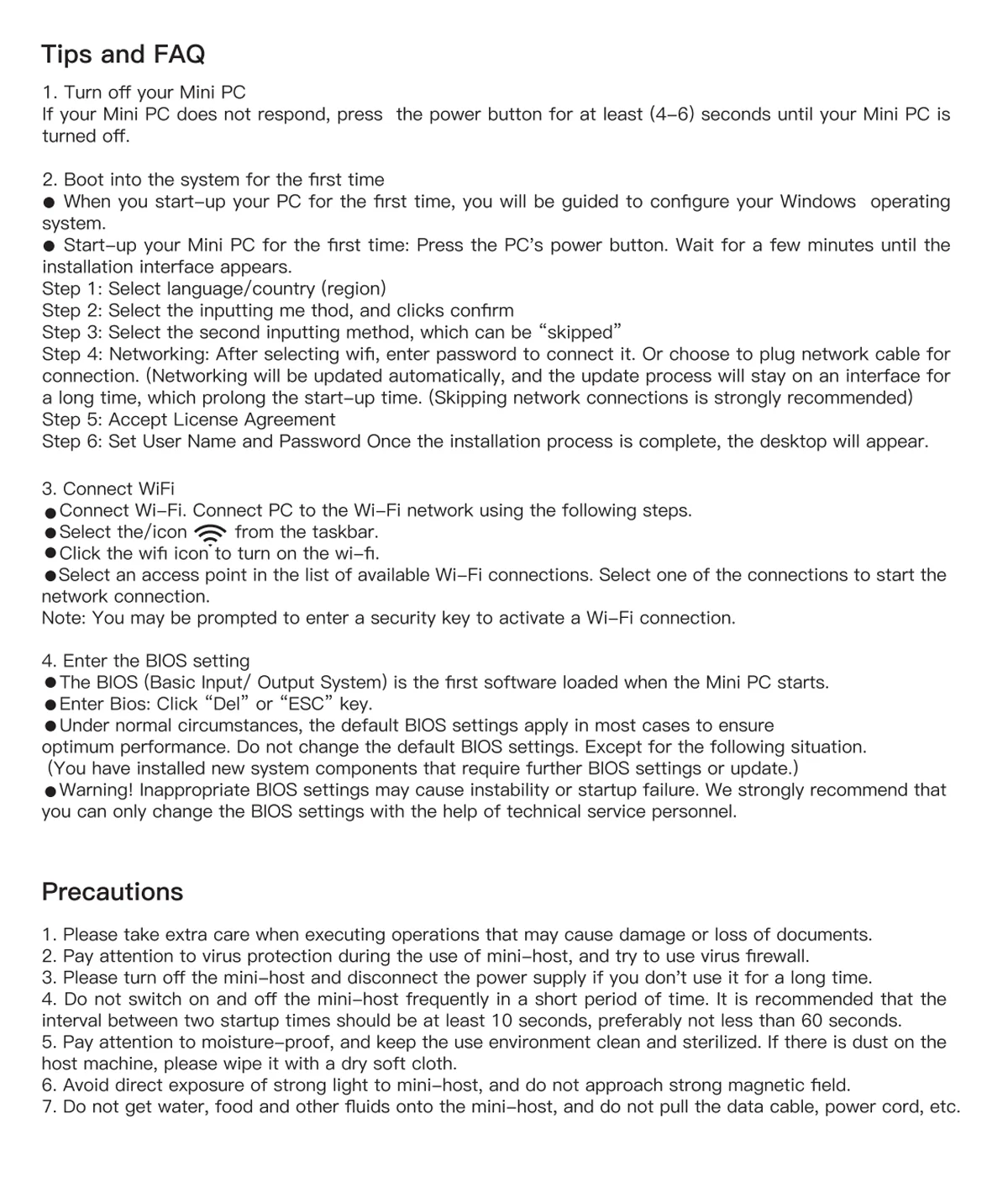7. 미니 호스트에 물, 음식 및 기타 액체가 들어 가지 않도록하고 데이터 케이블, 전원 코드 등을 당기지 마십시오.
