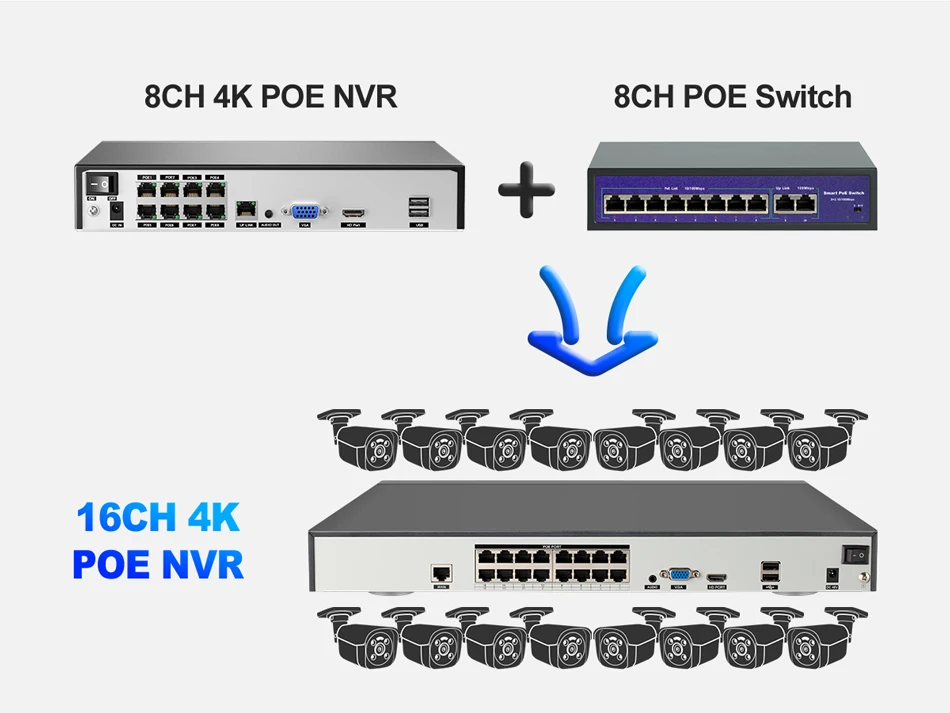 8CH POE 스위치를 함께 사용하면 16pcs 5MP POE 카메라로 확장 가능