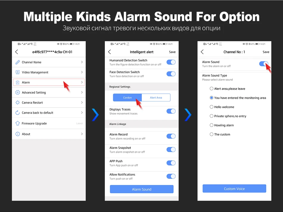 동시에 카메라가 경보를 울리고 빨간색과 파란색 표시등이 번갈아 깜박입니다. 알람 메시지가 전화 앱으로 푸시됩니다.