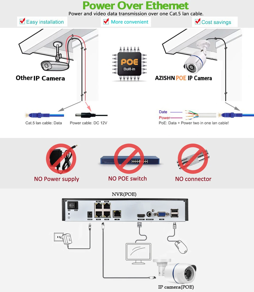 실제 플러그 앤 플레이 보안 시스템! 전원 공급 장치 및 비디오 단일 전송을 위해 각 IP 카메라를 NVR에 연결하는 단일 네트워크 케이블 사용.