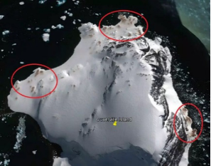 图1.阿德利企鹅的粪便染粉的雪形成一条条清晰可辨的“企鹅高速”