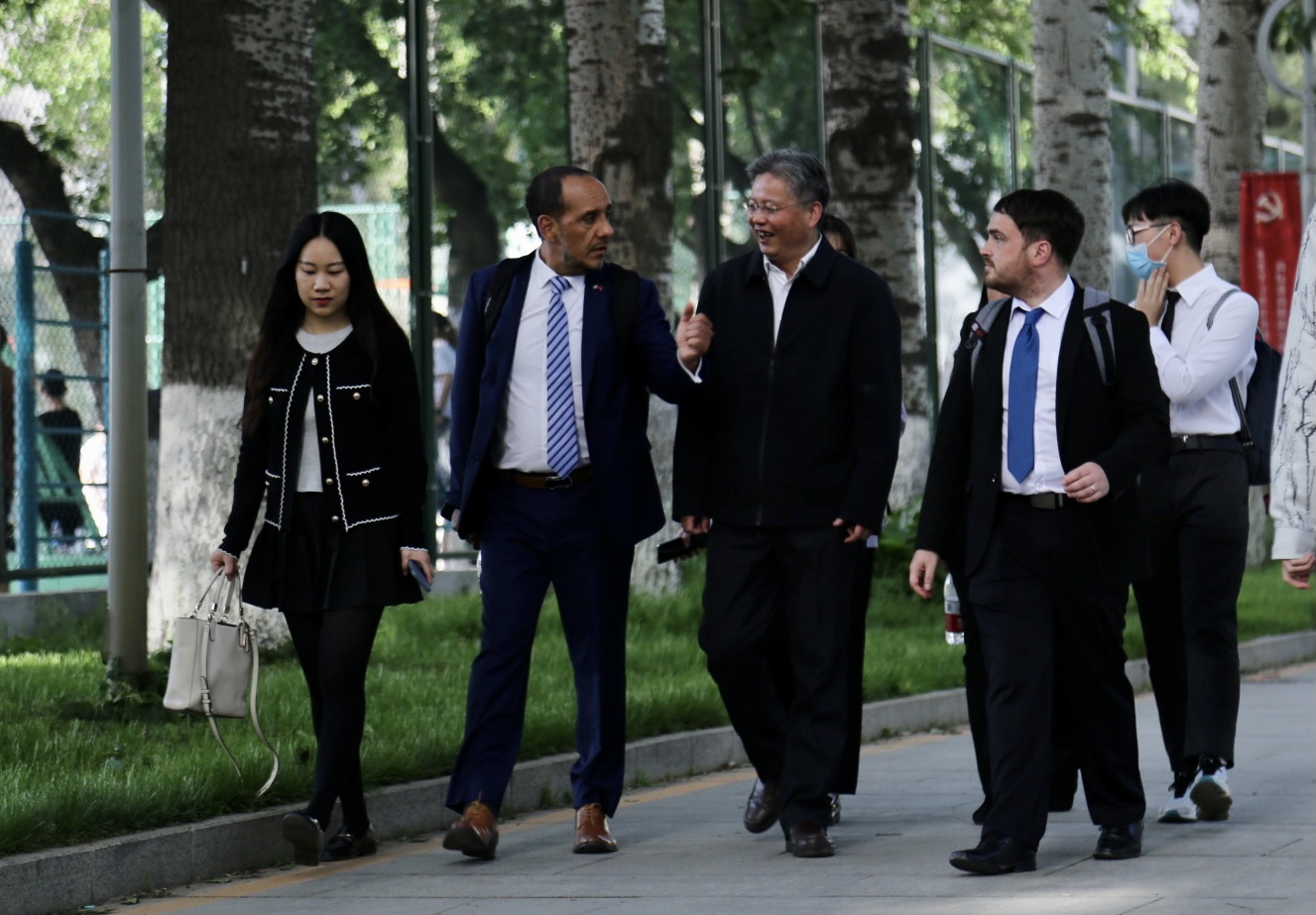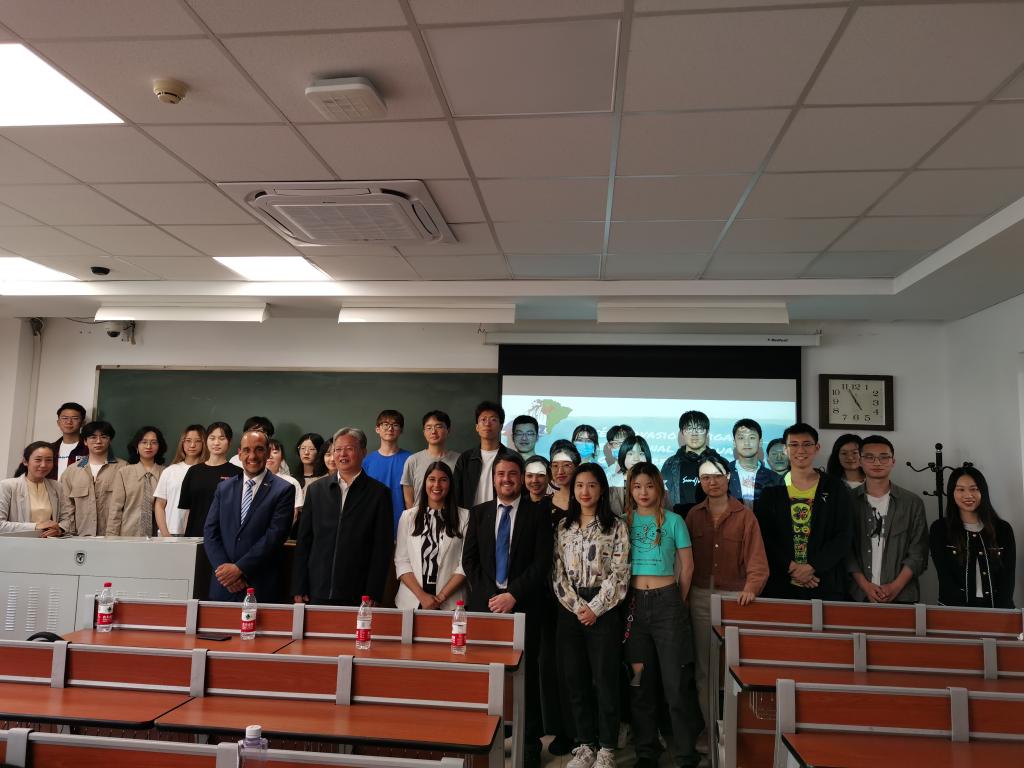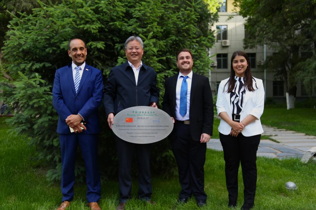 讲座结束后,在yl23455永利经理常福良的陪同下,乌拉圭驻华使馆领事塞尔西奥·德亚巴列、潘慧敏老师、张哲海老师一起参观了北外校园的“中国—乌拉圭友谊树”。