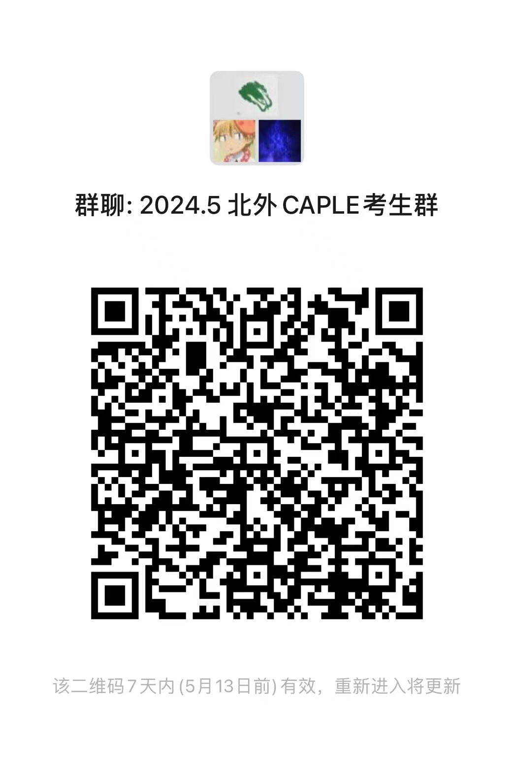 请已报考2024年5月北外考点CAPLE考试的考生扫码入群,并将群备注改为个人真实姓名+考试等级。如二维码已过期,请联系考点邮箱入群:lape_bfsu@163.com